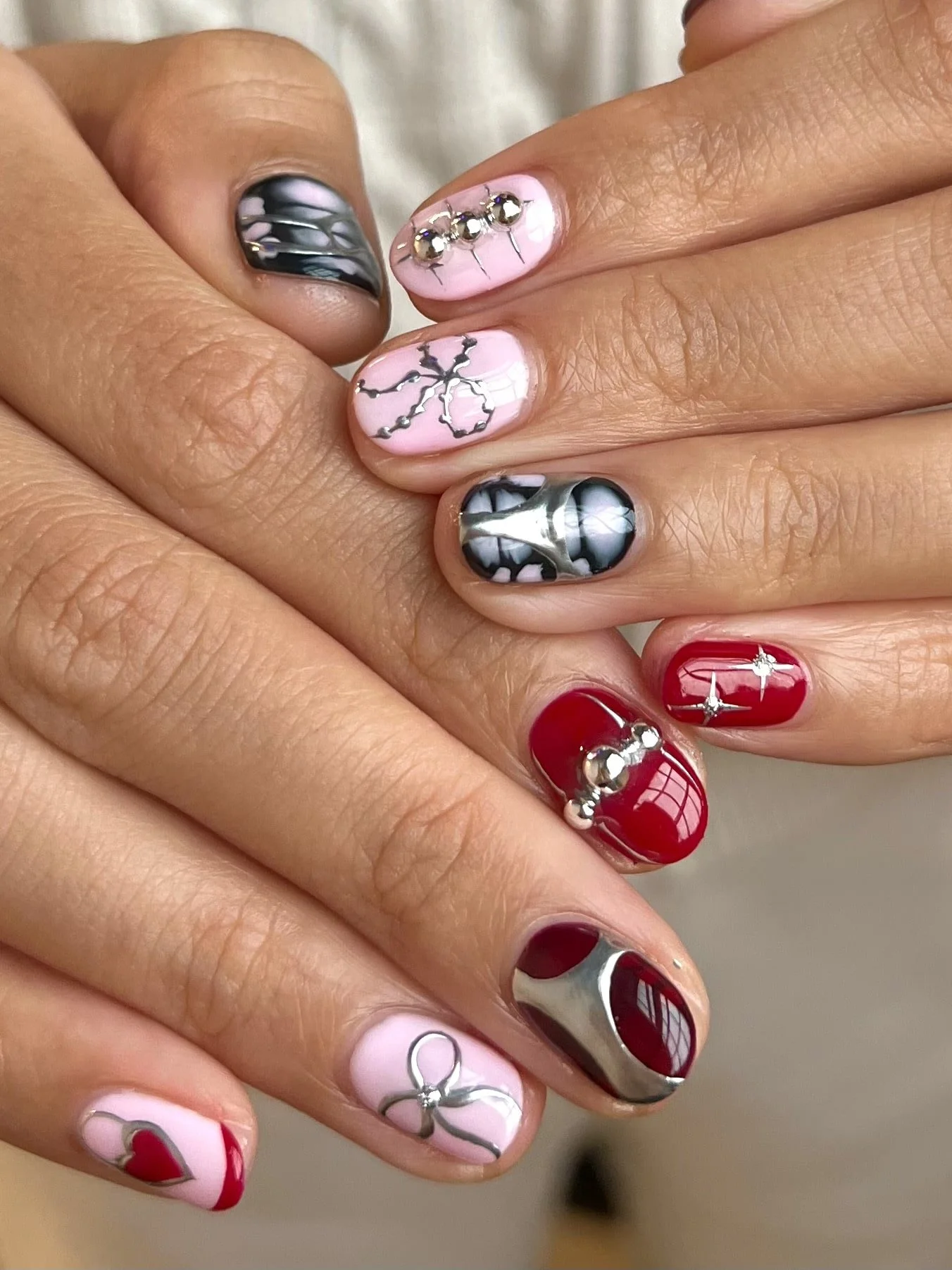 Edgy gel nail art with red, pink, and silver designs at Corktown Detroit nail salon